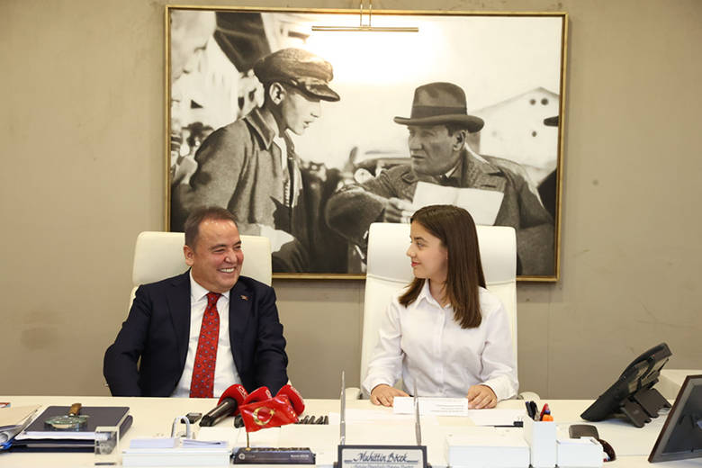 Çelenk sunma törenin ardından Büyükşehir Belediye Başkanlığı makamında devir teslim töreni yapıldı. Büyükşehir Belediye Başkanı Muhittin Böcek, koltuğunu Hüseyin Avni Çöllü Ortaokulu 7. Sınıf öğrencisi Simay Yade Çoban’a devretti. Devir teslimde Simay Yade Çoban’a Okul Müdürü Hasan Ayana, annesi Emine Çoban ve babası Ahmet Çoban eşlik etti.