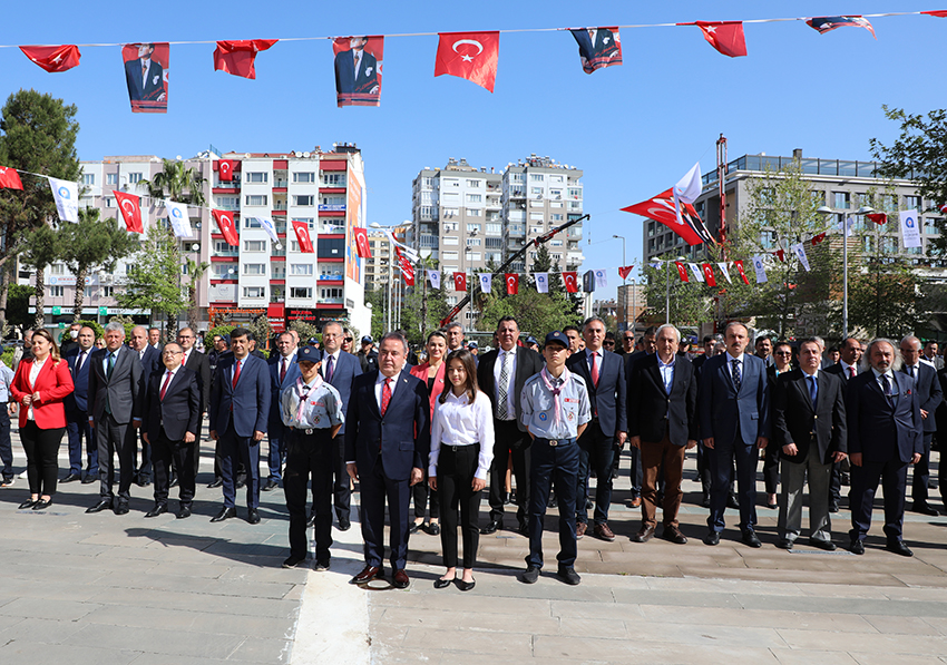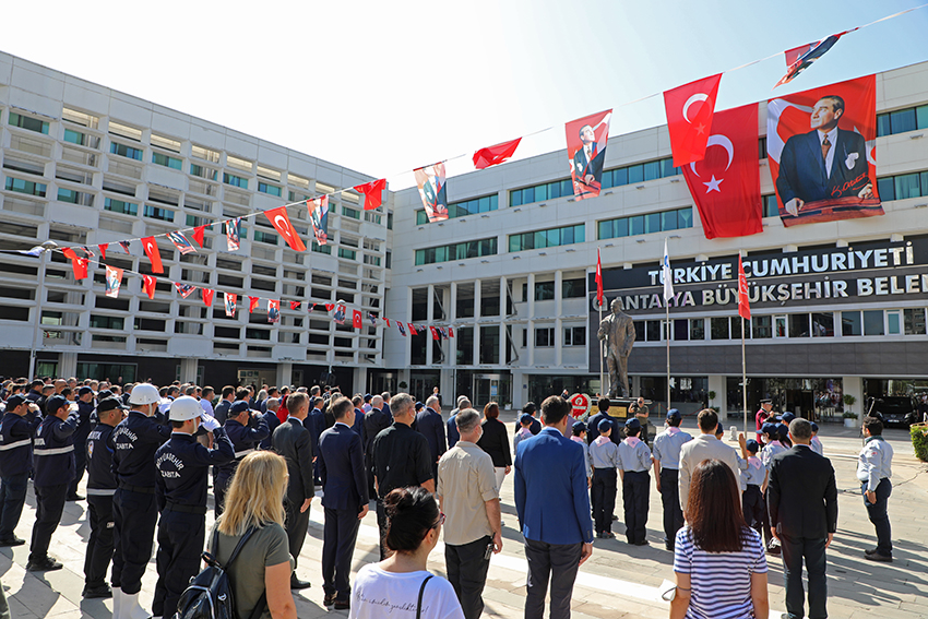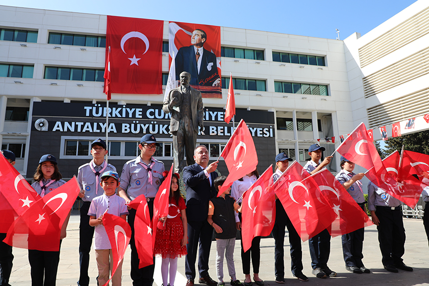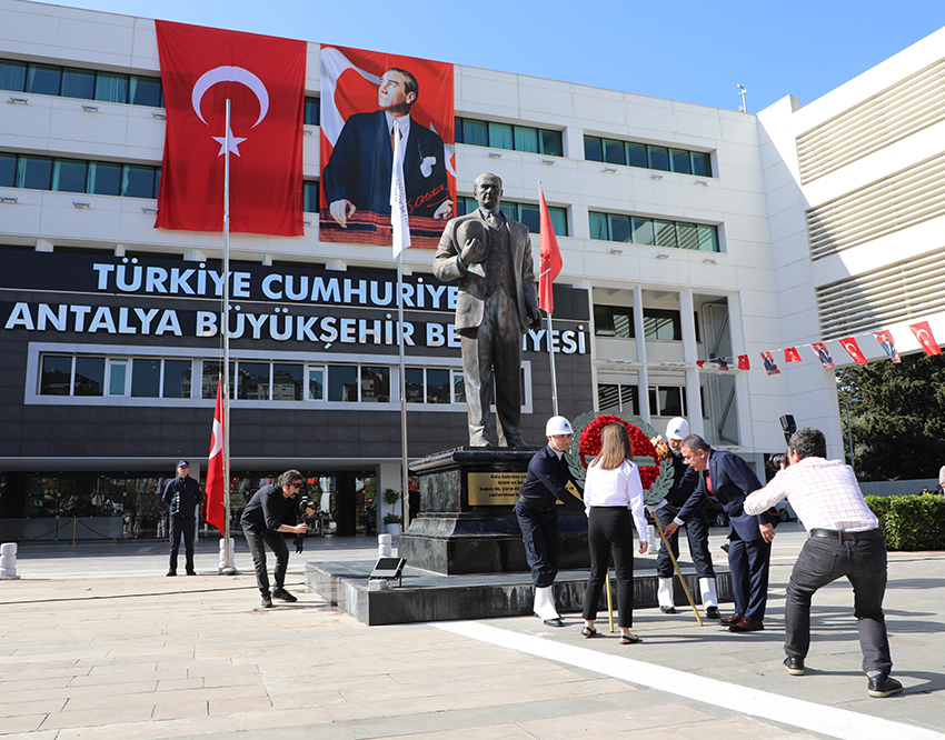 Türkiye Büyük Millet Meclisi’nin açılışının 102. Yıl dönümü ve 23 Nisan Ulusal Egemenlik ve Çocuk Bayramı çerçevesinde Antalya Büyükşehir Belediye Başkanlığı Hizmet binası önünde bulunan Atatürk Anıtına çelenk sunma töreni gerçekleşti. Antalya Büyükşehir Belediye Başkanı Muhittin Böcek, Genel Sekreter Cansel Tuncer, Genel Sekreter Yardımcıları, Başkan Danışmanları, Daire Başkanları, Şube Müdürleri, Belediye Personeli, Zabıta Personeli, Büyükşehir Belediyesi Aday İzcileri ve çok sayıda vatandaş katıldı. Saygı duruşu ve İstiklal Marşının okunmasının ardından Başkan Böcek, koltuğunu devir ettiği Simay Yade Çoban ile birlikte Atatürk Anıtına çelenk sundu. Başkan Böcek ve törene katılanlar coşkuyla bayrakları dalgalandırdı.