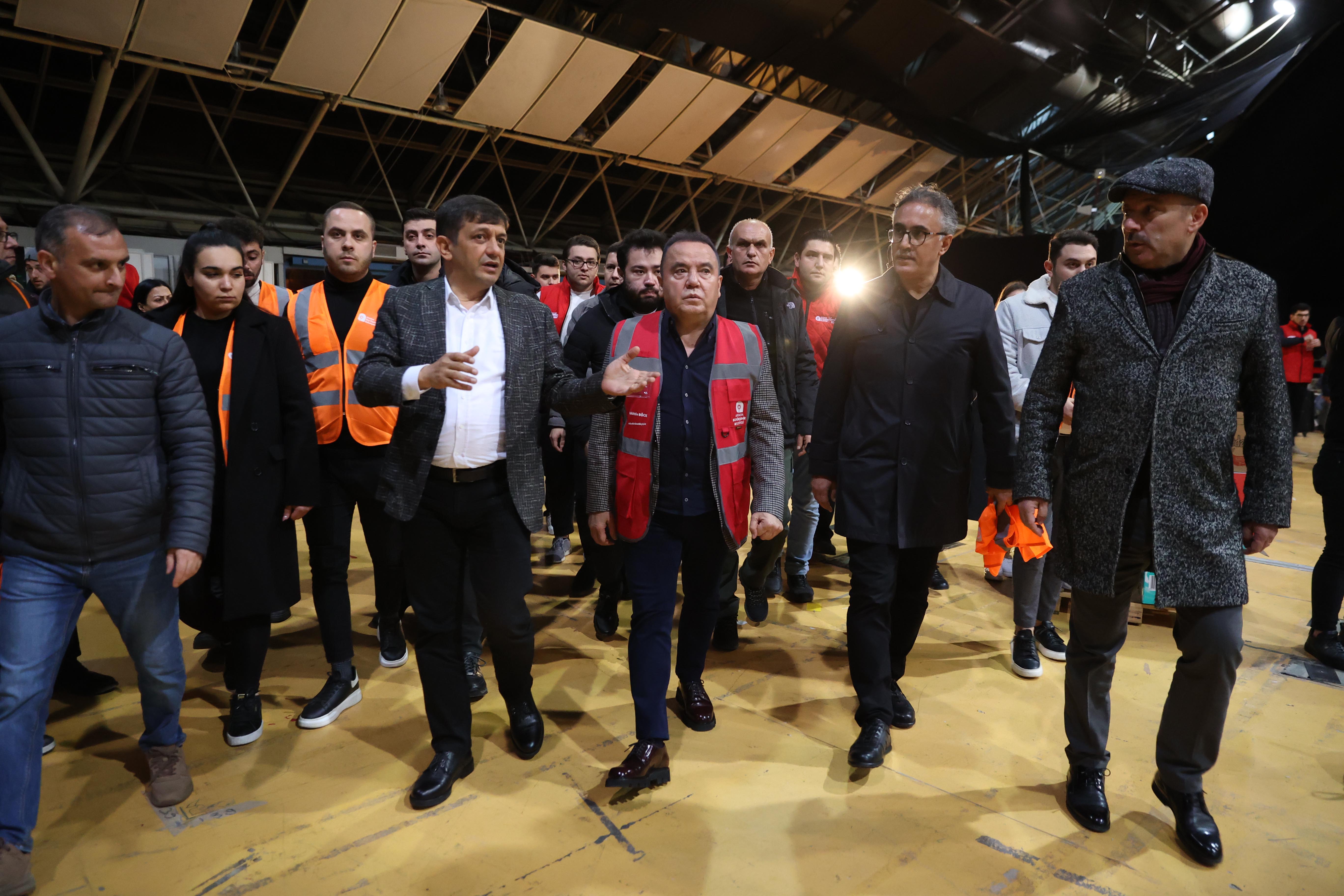 Antalya Büyükşehir Belediye Başkanı Muhittin Böcek, gece saatlerinde Cam Piramit’teki Afet Merkezi’ne gelerek çalışmalar hakkında bilgi aldı. Çalışmaları koordine eden Başkan Muhittin Böcek, ilçelerdeki vatandaşların da ATASEM Kurs Merkezleri’ne yardımlarını ulaştırabileceğini söyledi. “Birlik ve beraberlik içinde bu yaraları saracağız” diyen Başkan Muhittin Böcek, şu bilgileri verdi: “Dün itibariyle ilk etapta arama kurtarmada uzman itfaiye ekiplerimizin de bulunduğu 64 araç ve 218 personelimiz deprem bölgeleri Hatay ve Maraş’a ulaştı. Sosyal Hizmetler Daire Başkanlığımız gıda, ekmek, su ve battaniye yardımına başladı.