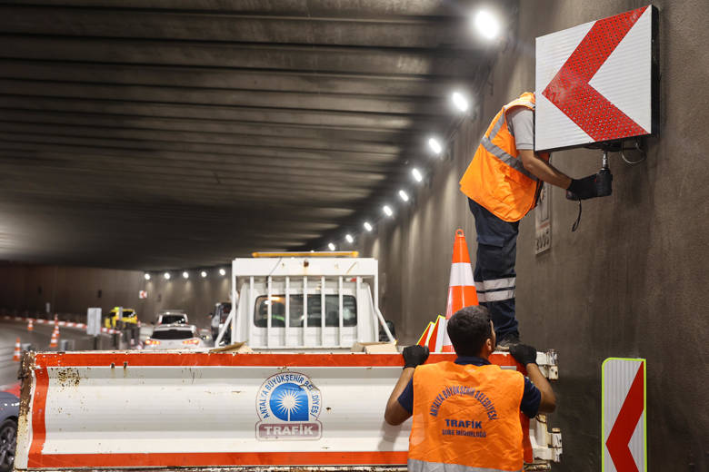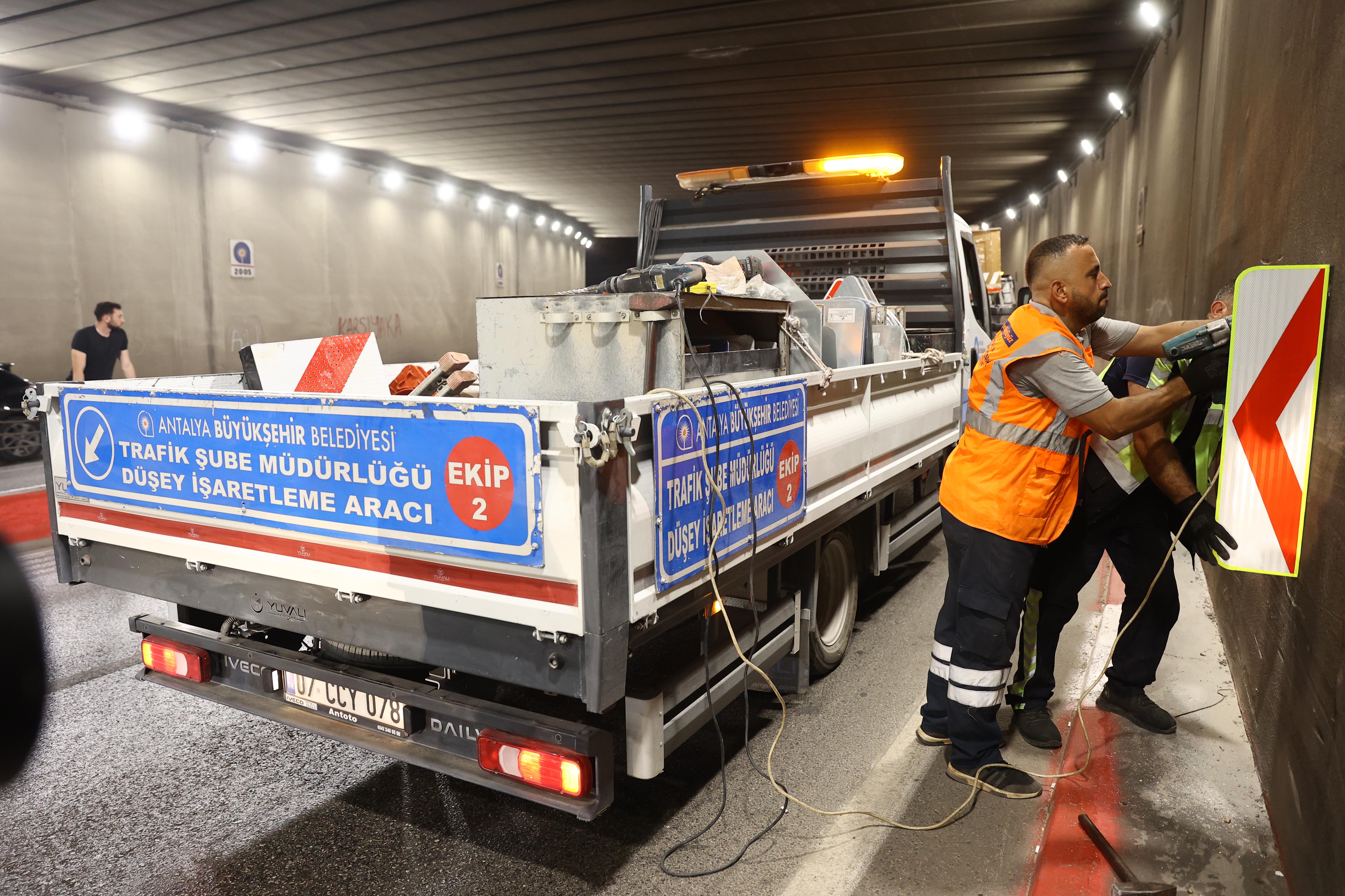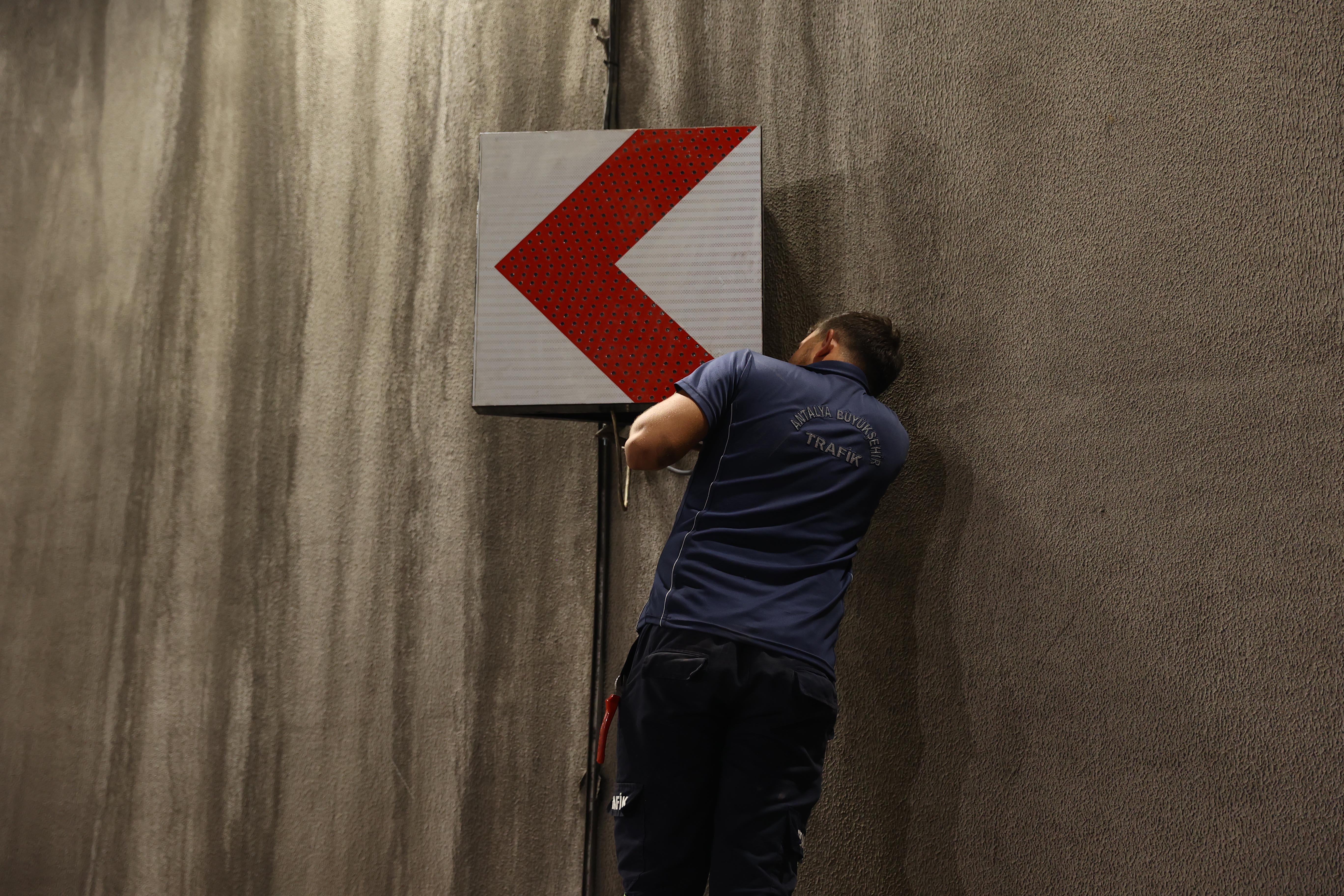 Antalya Büyükşehir Belediyesi Trafik Şube Müdürlüğü Düşey İşaretleme Birim Sorumlusu Erdem Aslan, alt ve üst geçitlerde tehlikeli olarak belirlenen yerlerde çalışmalarını 7 gün 24 saat esasına göre yürüttüklerini söyledi. Erdem Aslan “Meydan Alt Geçidi sık sık kazaların yaşandığı bir nokta. Ekiplerimizle birlikte alt geçidin viraj kısımlarına elektrikli ve reflektif malzemelerden oluşan trafik işaret levhalarının montajını gerçekleştirdik. Ayrıca alt geçitte yer alan ‘yavaş’ ibarelerini ve şeritlerin belirleyici olmasını sağlayan bordür boyalarını yeniledik” dedi.