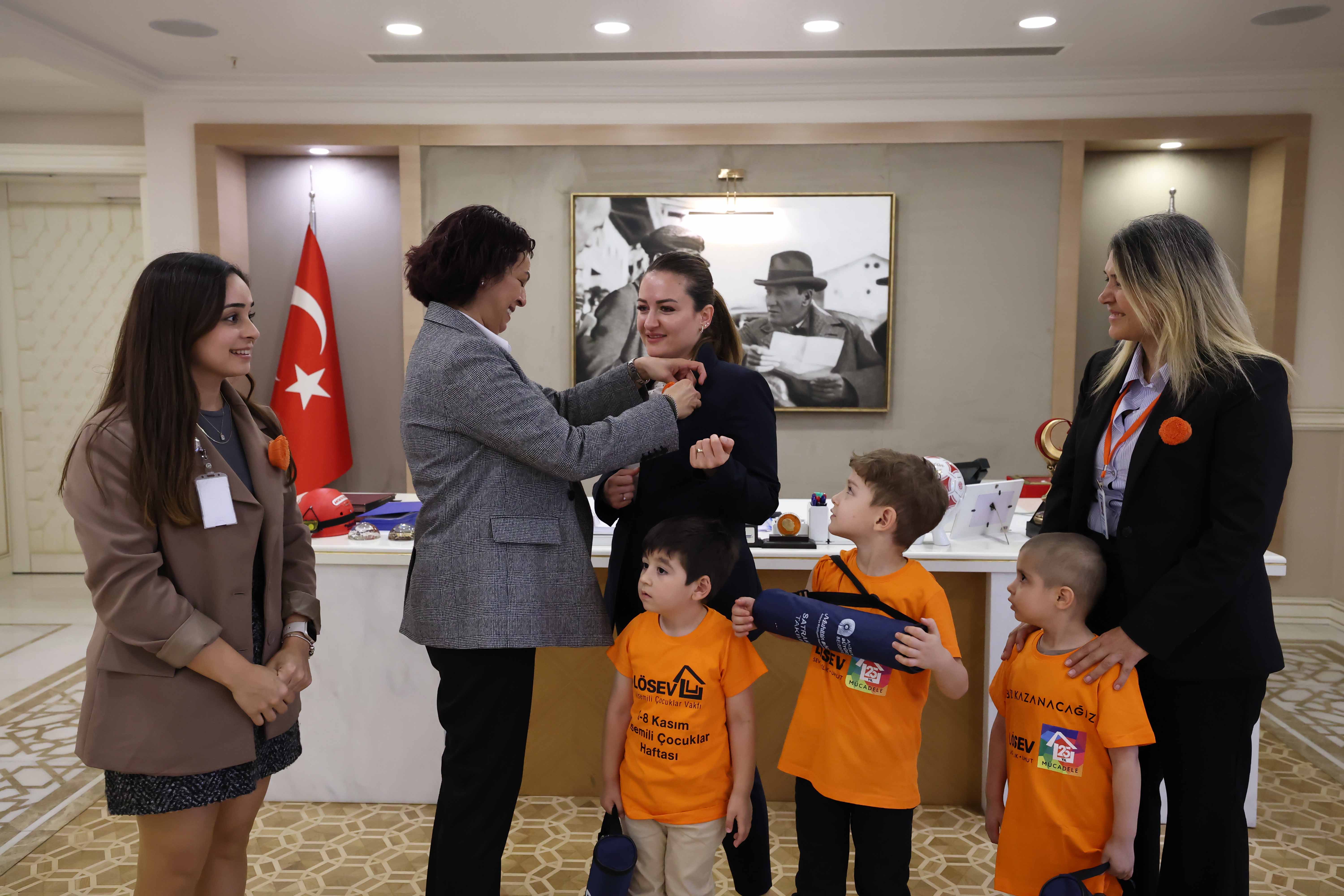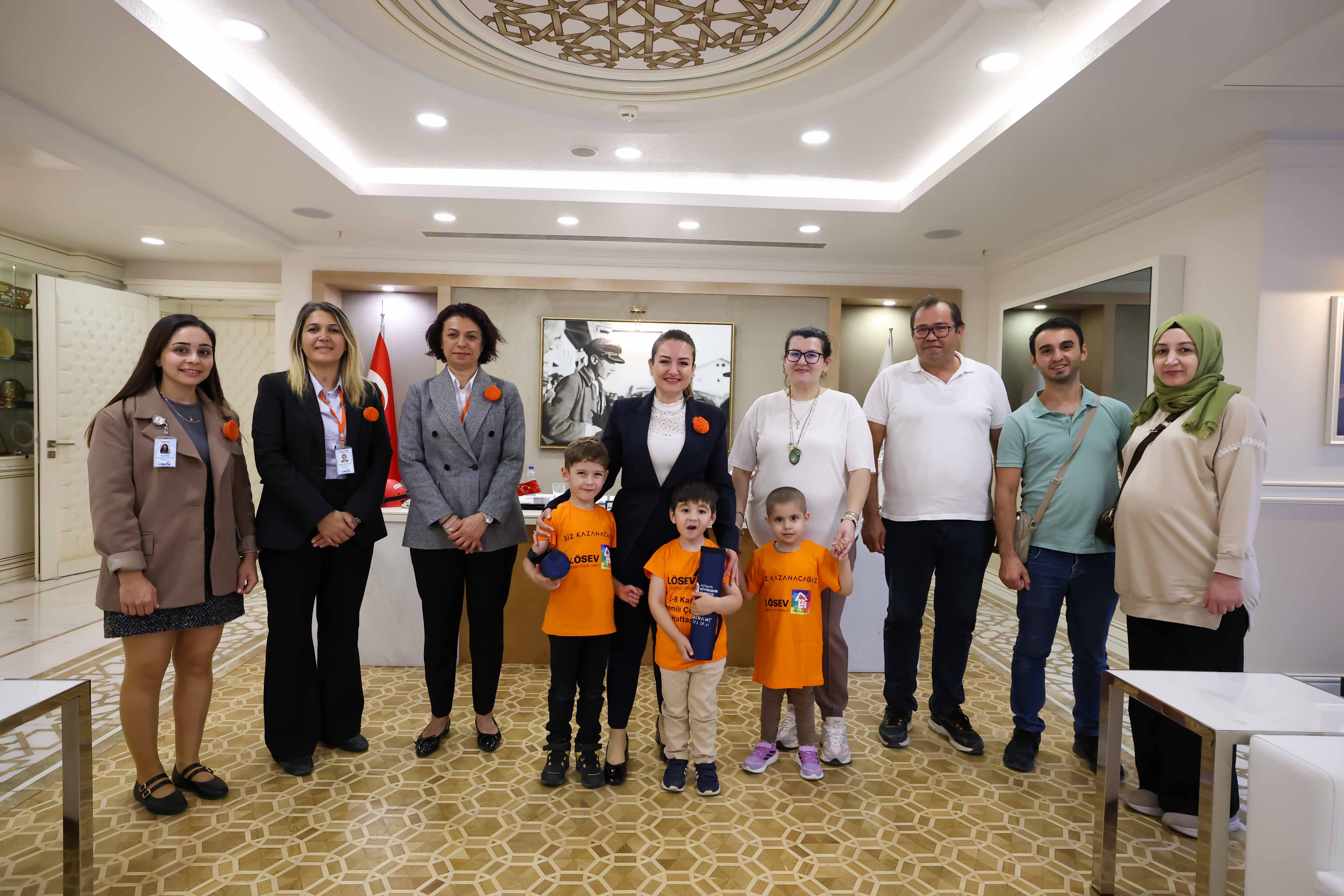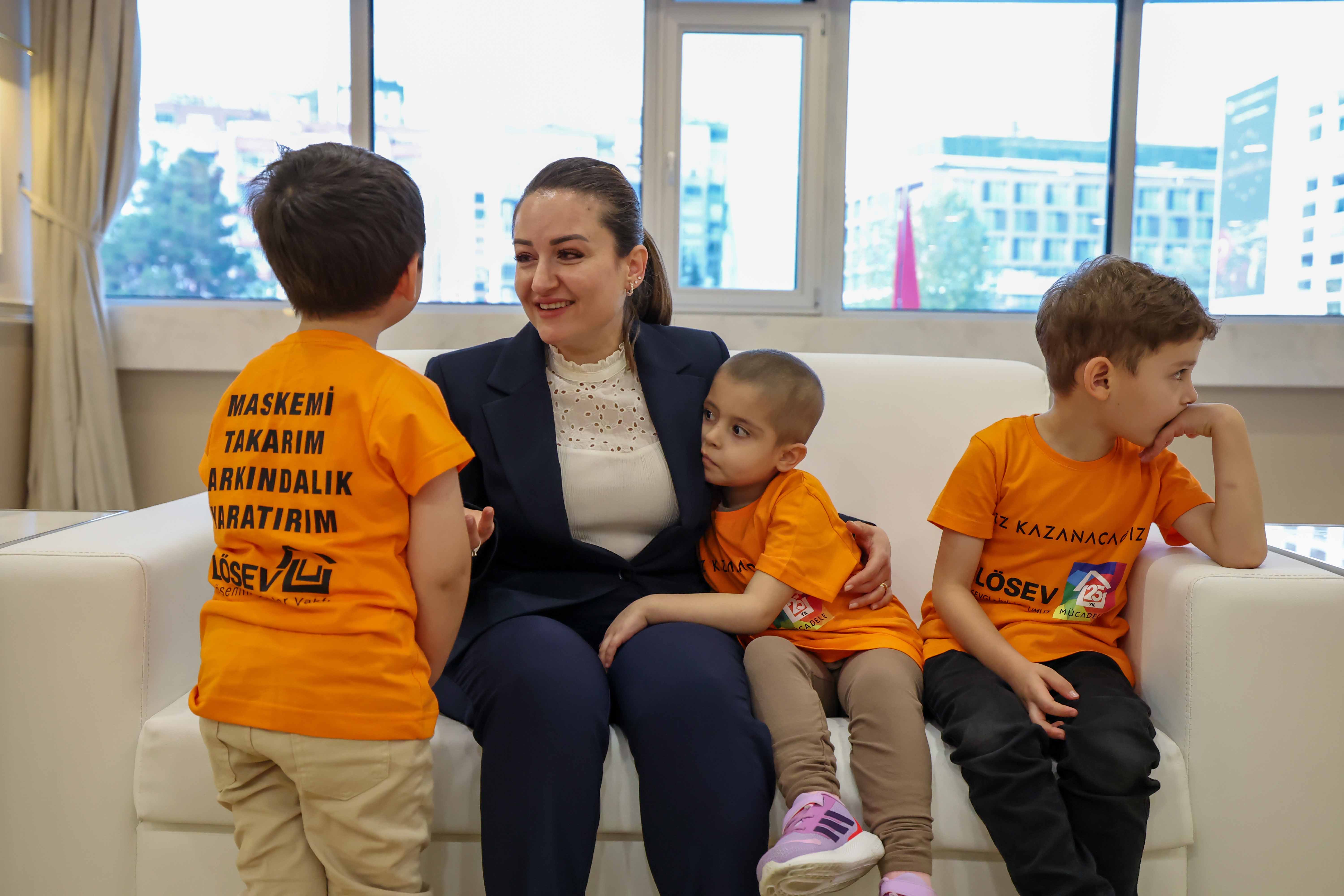 Büyükşehir Belediyesi Başkan Vekili Büşra Özdemir, 2-8 Kasım Lösemili Çocuklar Farkındalık Haftası kapsamında LÖSEV İl Koordinatör Yardımcısı Özlem Uğurel, Sosyal Hizmetler İl Koordinatör Yardımcısı Seyhan Mansuroğlu, Sosyal Hizmetler İl Müdürlüğü çalışanı Melek Cin ve LÖSEV’li çocuklar Atiye Deniz, Yiğit ve Giray ile bir araya geldi. Başkan Vekili Özdemir, çocuklarla sohbet ederek, başkanlık makamını gezdirdi. LÖSEV İl Koordinatör Yardımcısı Özlem Uğurel, Başkan Vekili Özdemir’in yakasına farkındalık yaratmak amacıyla bu yılın rengi olan turuncu çiçek taktı.