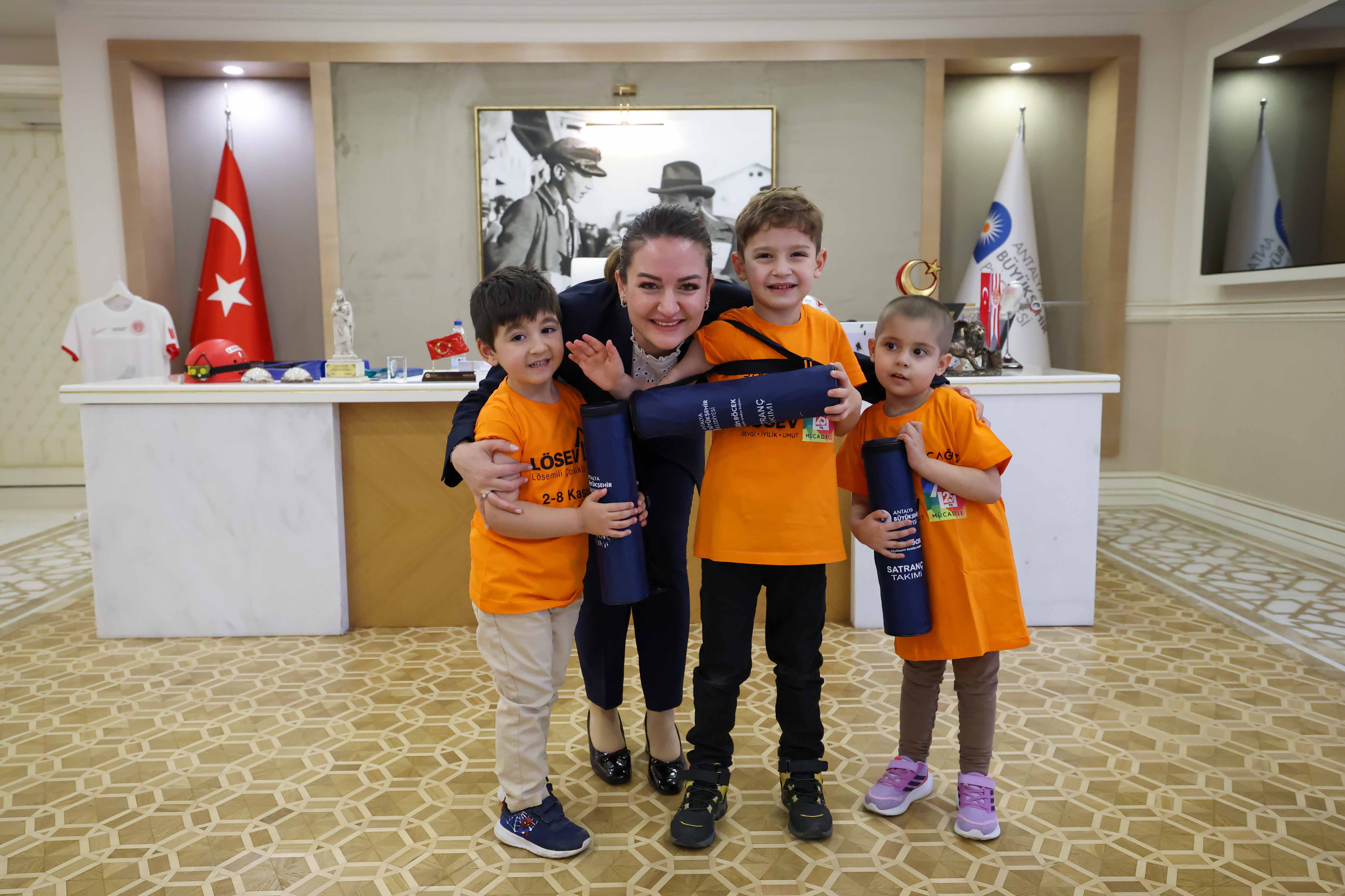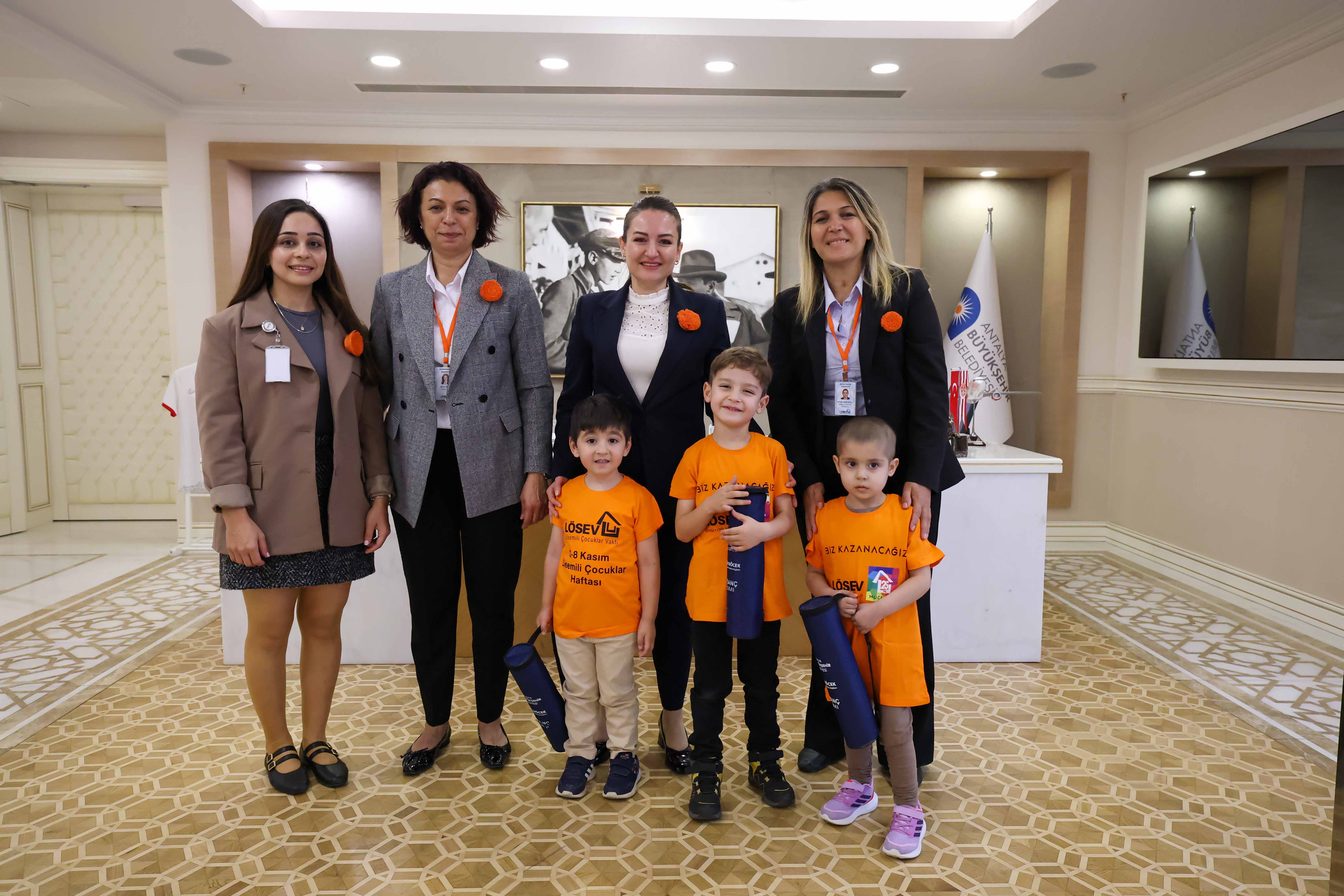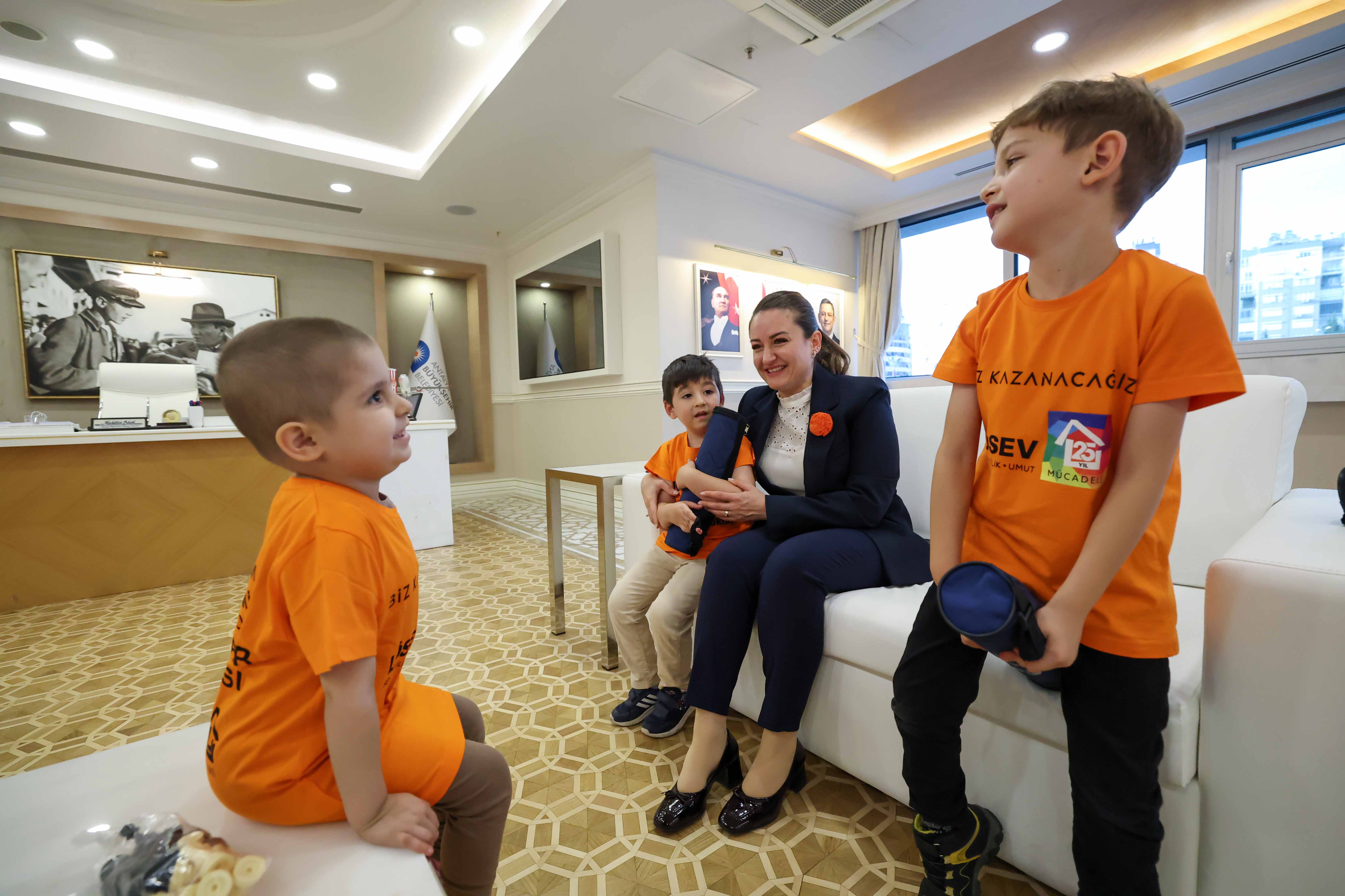 Büyükşehir Belediyesi Başkan Vekili Büşra Özdemir, 2-8 Kasım Lösemili Çocuklar Farkındalık Haftası kapsamında LÖSEV İl Koordinatör Yardımcısı Özlem Uğurel, Sosyal Hizmetler İl Koordinatör Yardımcısı Seyhan Mansuroğlu, Sosyal Hizmetler İl Müdürlüğü çalışanı Melek Cin ve LÖSEV’li çocuklar Atiye Deniz, Yiğit ve Giray ile bir araya geldi. Başkan Vekili Özdemir, çocuklarla sohbet ederek, başkanlık makamını gezdirdi. LÖSEV İl Koordinatör Yardımcısı Özlem Uğurel, Başkan Vekili Özdemir’in yakasına farkındalık yaratmak amacıyla bu yılın rengi olan turuncu çiçek taktı.