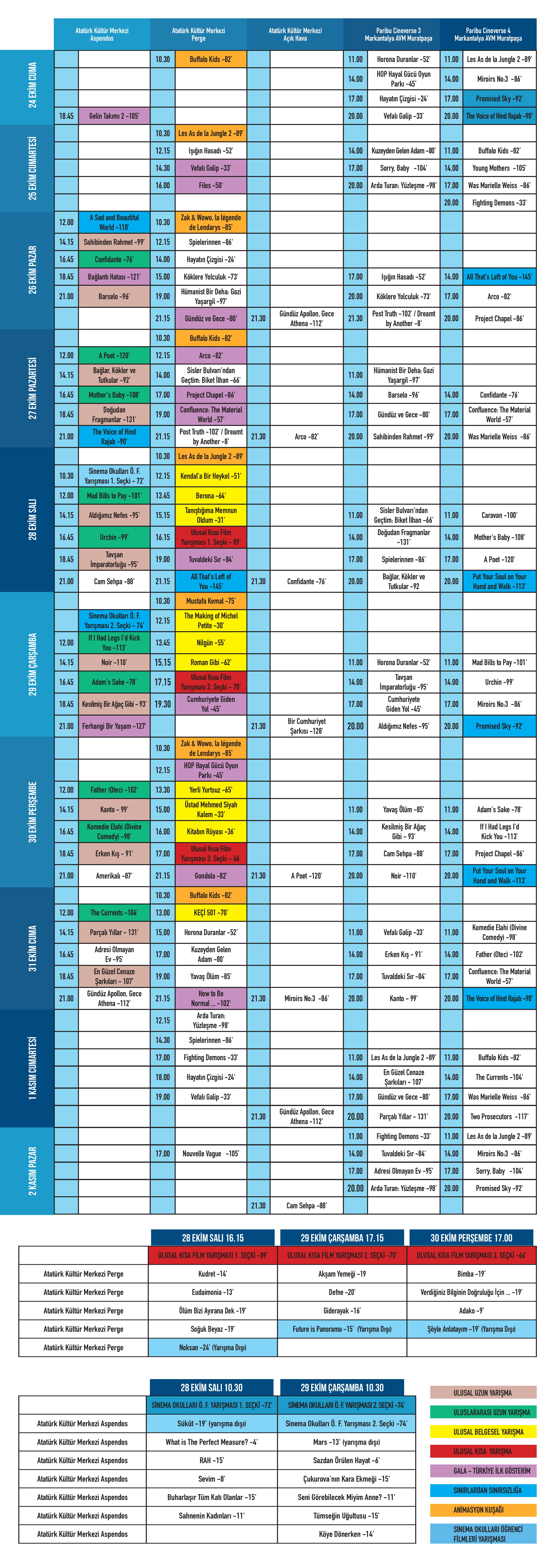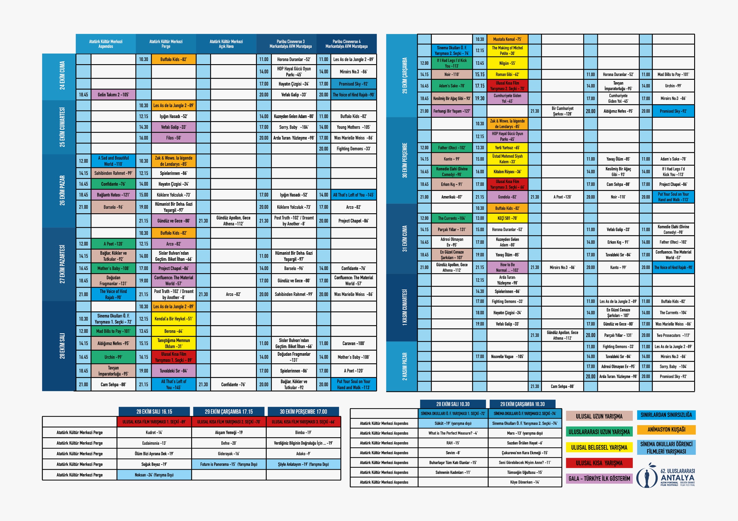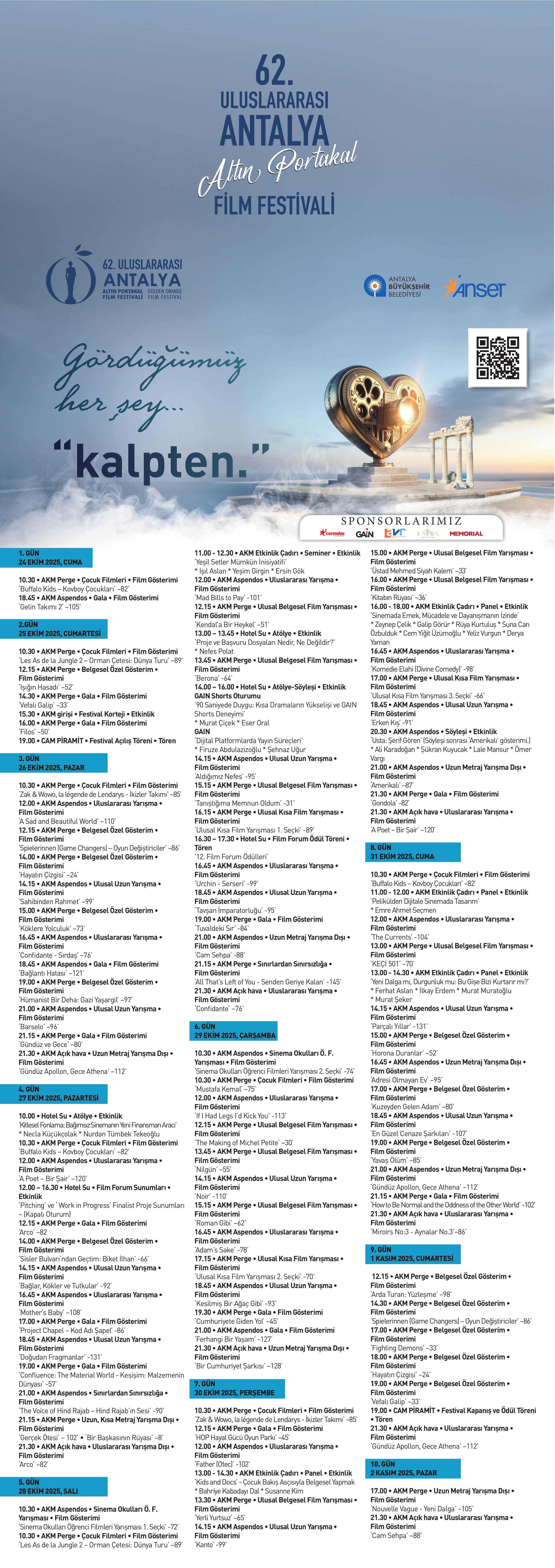 Mustafa Kemal ATATÜRKTürkiye’nin en köklü film festivali Uluslararası Antalya Altın Portakal Film Festivali’nin programı açıklandı. Bu sene 62.’si gerçekleştirilecek Uluslararası Antalya Altın Portakal Film Festivali, bu yıl ‘Kalpten’ temasıyla dolu dolu programıyla sinemaseverler ile buluşacak. 24 Ekim-2 Kasım 2025 tarihleri arasında gerçekleştirecek festivalde yerli ve yabancı 104 film sinema tutkunlarıyla buluşurken, 70 film Türkiye’de ilk kez Antalya’da gösterime girecek