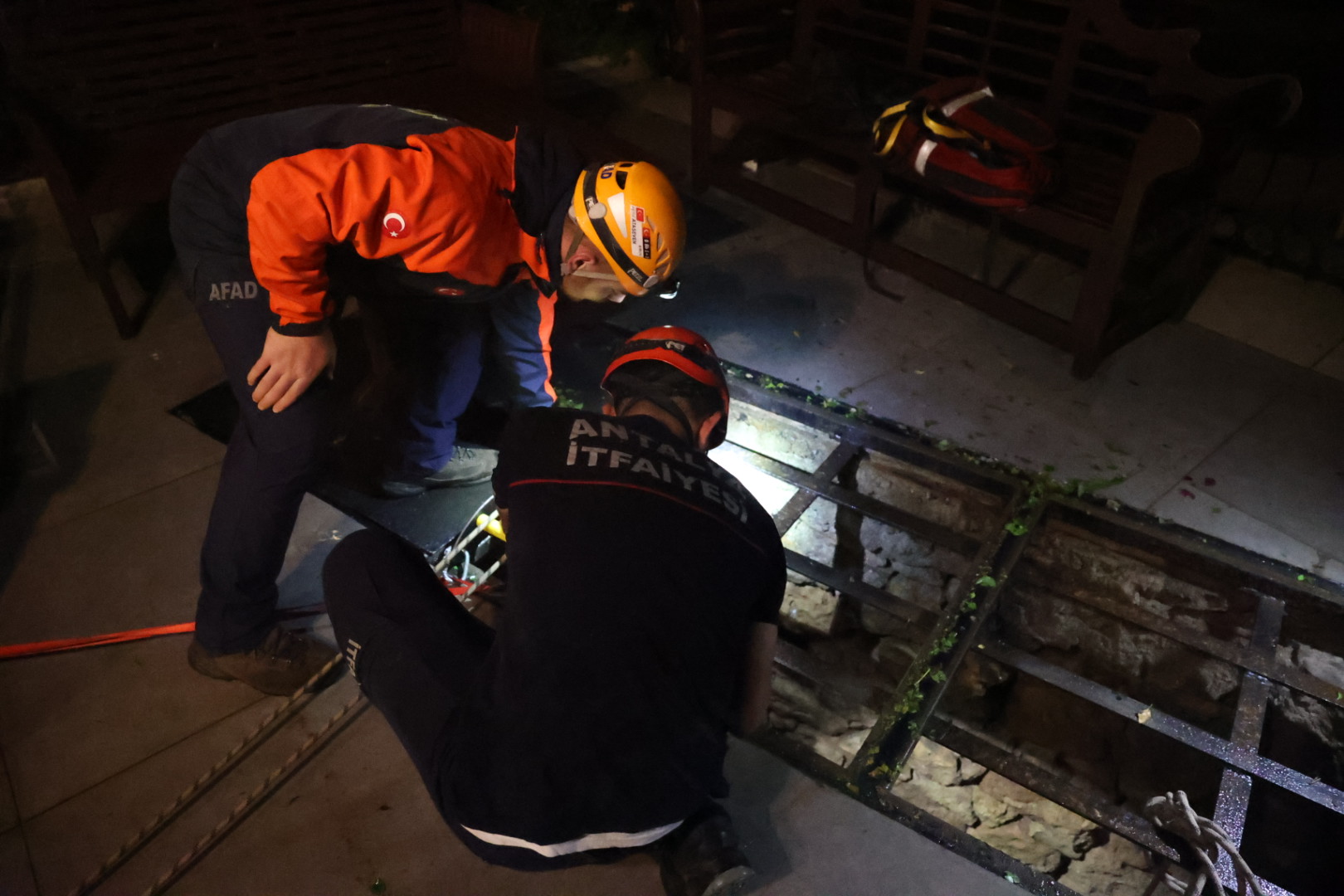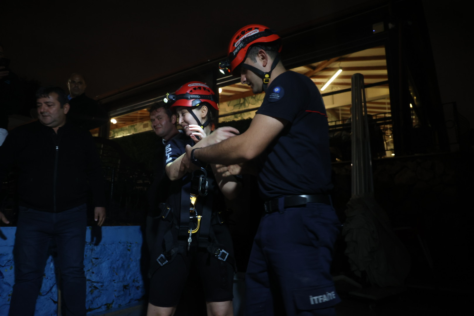 Antalya Deniz Polisi tekneyle denizden mağaraya ulaşmaya çalıştı ancak şiddetli rüzgar nedeniyle geri dönmek zorunda kaldı. AFAD ve itfaiye ekileri falezlerden aşağı inen bir geçitten mağdurların bulunduğu noktaya ulaşmayı denedi. Aşağı inen ekipler mahsur kalan mağdurları buldu. Daha sonra Antalya Büyükşehir Belediyesinde görevli itfaiye erleri aşağı inerek mahsur kalan iki kişiyi halatla bağladı. Mağdur vatandaşlar yukarı çekilerek kurtarıldı. Yukarı çıkarıldıktan sonra olay yerinde bulunan sağlık ekipleri tarafından mağdurların sağlık kontrolü gerçekleştirildi. Sağlık durumları iyi olan vatandaşlar kendilerini kurtaran ekiplere teşekkür etti.