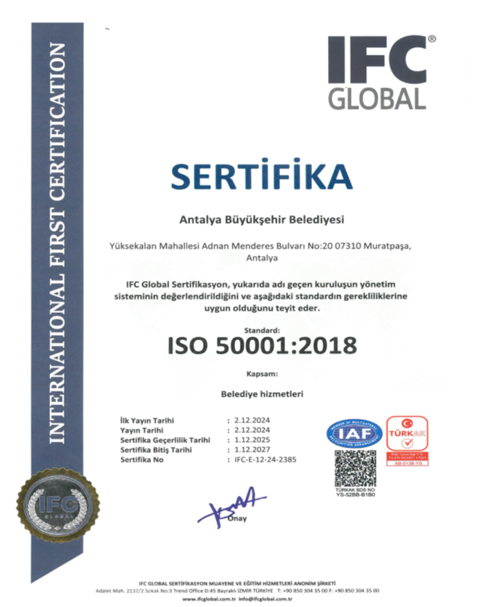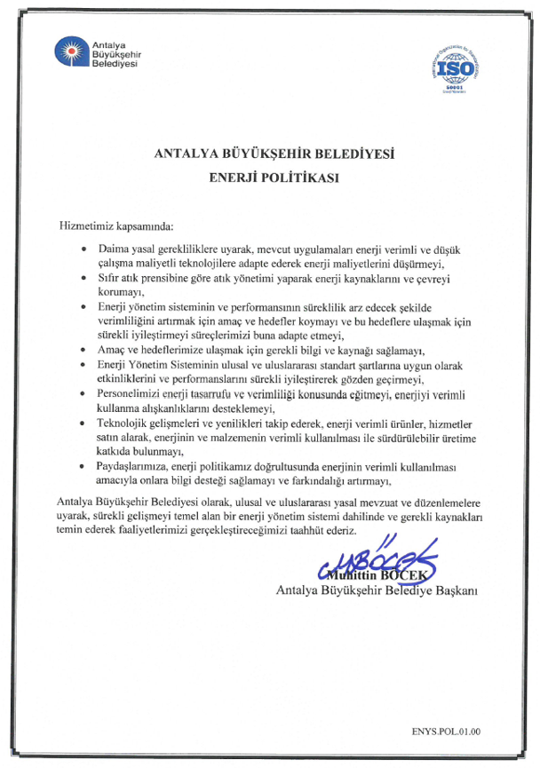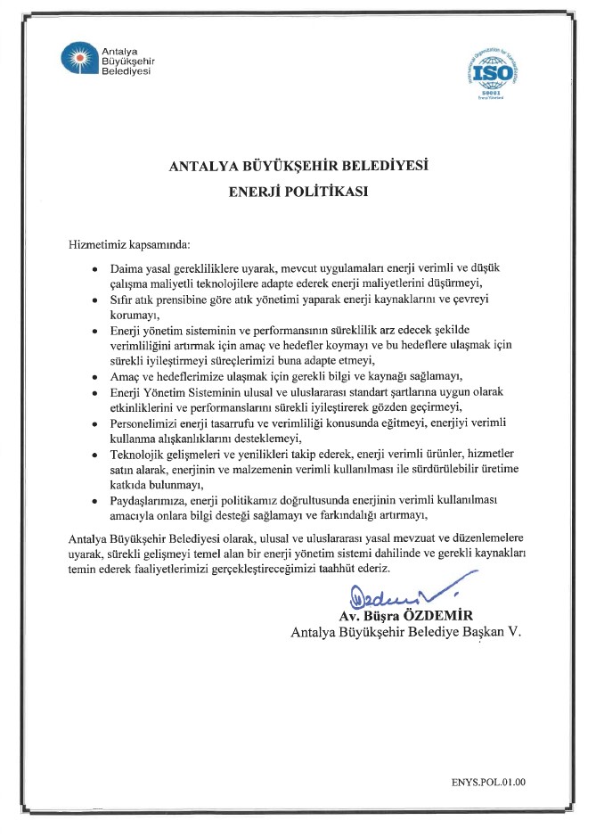 Antalya Büyükşehir Belediyesi, enerji verimliliğini artırma ve enerji yönetimini optimize etme konusunda önemli bir adım atarak, uluslararası standartlara uygun ISO 50001 Enerji Yönetim Sistemini Antalya’da hayata geçiren ilk belediye olmuştur. Bu sistem sayesinde, belediyemiz ve ASAT ana hizmet binalarındaki enerji performansı sürekli olarak izlenmekte ve düzenli iyileştirmelerle daha verimli bir enerji kullanımı sağlanmaktadır. Antalya Büyükşehir Belediyesi olarak attığımız bu adım, şehrimizin sürdürülebilir kalkınma hedeflerine katkı sunmaya ve enerji yönetiminde öncü olmaya devam etmektedir.