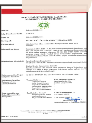 İlk olarak Antalya Büyükşehir Belediyesi ana hizmet binasının 1 Ocak 2020-31 Aralık 2020 tarihleri arasını temel alarak hesaplanan Sera Gazı Beyanı ve emisyon miktarının TSE standartlarına uygun olduğu doğrulandı. Devam eden süreçte 2020 yılı emisyonlarını sıfırlayan ana hizmet binamız ile yaptığımız enerji yönetim uygulamaları, sera gazı azaltım çalışmaları doğrultusunda Antalya Büyükşehir Belediyesi TSE’den ‘İklim Dostu Kuruluş’ belgesi alan ilk belediye oldu. Bu belge bizim bu konudaki çalışmalarımızı tescillemiş oldu.