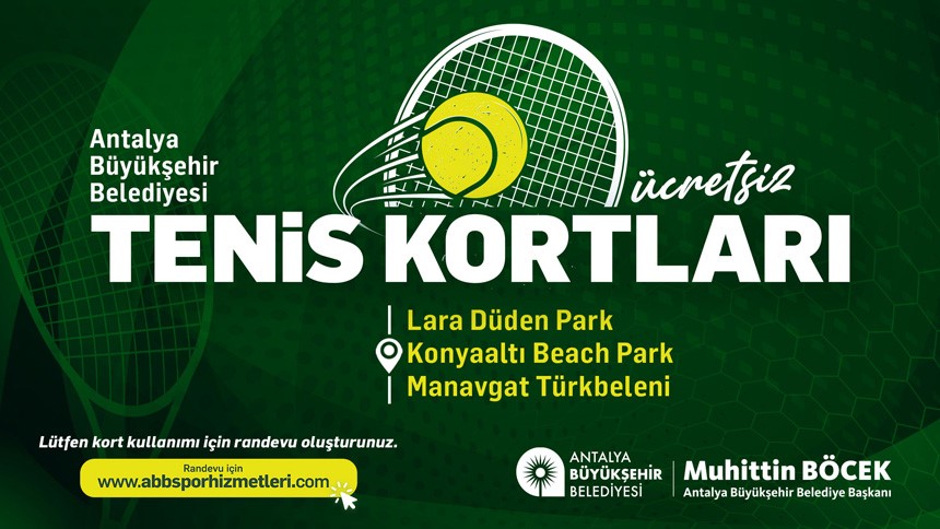 Antalya Büyükşehir Belediyesi’ nin Lara Düden Park’ ta iki adet, Konyaaltı Beach Park’ ta iki adet, Manavgat Türkbelenin’ de 1 adet olmak üzere toplam 5 tenis kortu, hafta içi her gün belirlenen saatler arasında vatandaşlarımıza hizmet vermektedir. Kortları kullanmak isteyen vatandaşlar https://www.abbsporhizmetleri.com/ internet adresine girerek rezervasyon yapabilirler. Tenis rezervasyonunu internet üzerinden alan bir kişi, 1 saat partneri ile birlikte ücret ödemeden tenis oynayabilir.